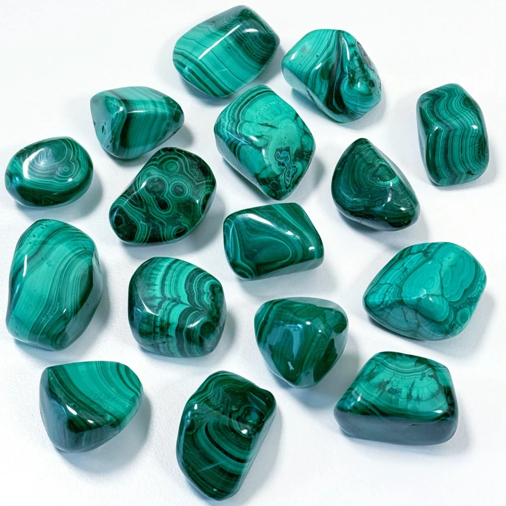 Malahit je kamen transformacije in zaščite. Njegova globoko zelena barva s značilnimi vzorci prinaša občutek varnosti, moči in notranjega ravnovesja. Malahit pomaga odstranjevati negativne energije, čustvene blokade in staro karmo, hkrati pa spodbuja rast, spremembe in osebni razvoj.